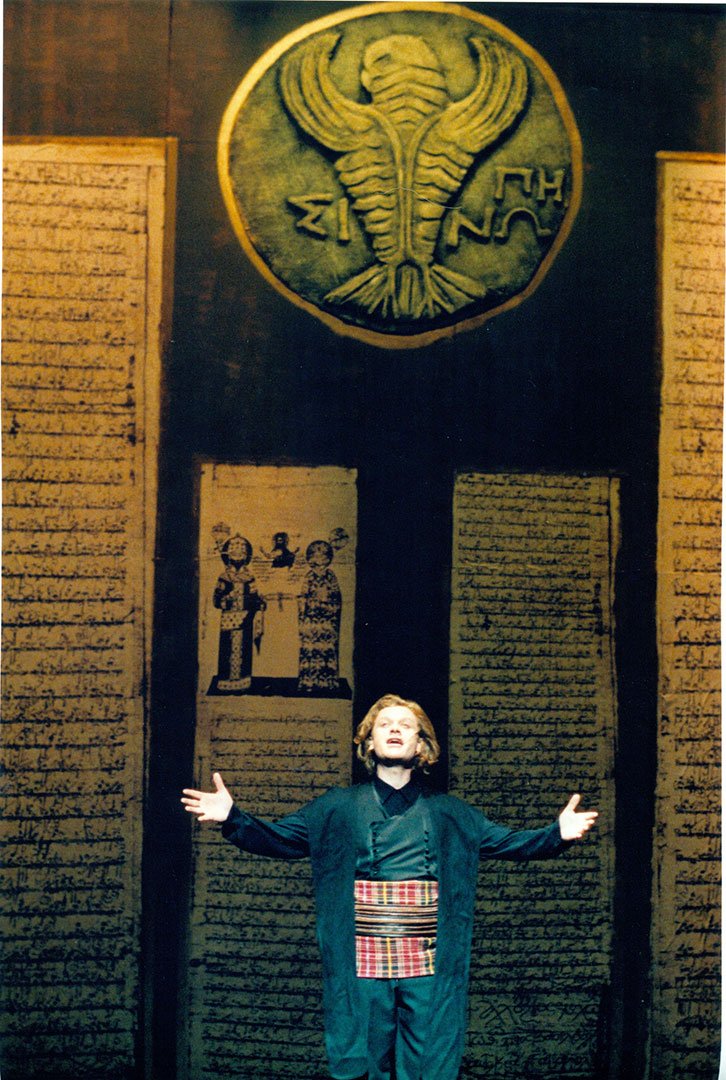 He presented the play “Ode to Alexander,” a new work performed with symphonic orchestra and choir. It was performed several times, first at the Athens Concert Hall; a year later at the Herodeon (Herod’s Odeon), where it received amazing reviews; and finally, reaching a peak of success, at the Pyramids of Egypt, with the symphonic orchestra and choir of the Cairo Opera, under the auspices of both the Greek and Egyptian governments. This was the first time that an artist was allowed to perform by the pyramids.